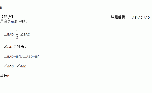 B 【解析】试题解析:∵AB=AC,AD是底边BC的中线, ∴∠BAD=∠BAC ∵∠BAC是钝角, ∴∠BAD>45°,∠ABD<45° ∴∠BAD>∠ABD 故选B.