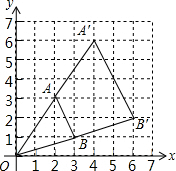 解:(1)如图所示:△OA′B′即为所求,A′(4,6)、B′(6,2);