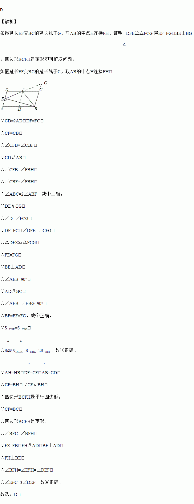 如图,在 ABCD中,CD=2AD,BE⊥AD于点E,F为DC的中点,连结EF、BF,下列结论:①∠ABC=2∠ABF;②EF=BF;③S四边形DEBC=2S△EFB;④∠CFE=3∠DEF,其中正确结论的个数共有( ).