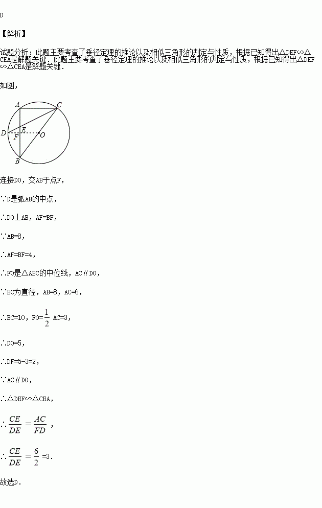 如图,Rt△ABC内接于⊙O,BC为直径,AB=8,AC=6,D是弧AB的中点,CD与AB的交点为E,则等于( )