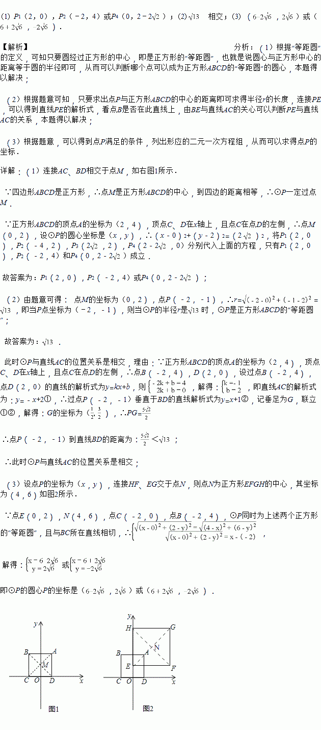 (3)如图2,在正方形ABCD所在平面直角坐标系xOy中,正方形EFGH的顶点F的坐标为(8,2),顶点E、H在y轴上,且点H在点E的上方.若⊙P同时为上述两个正方形的“等距圆”,且与BC所在直线相切,求⊙P的圆心P的坐标.