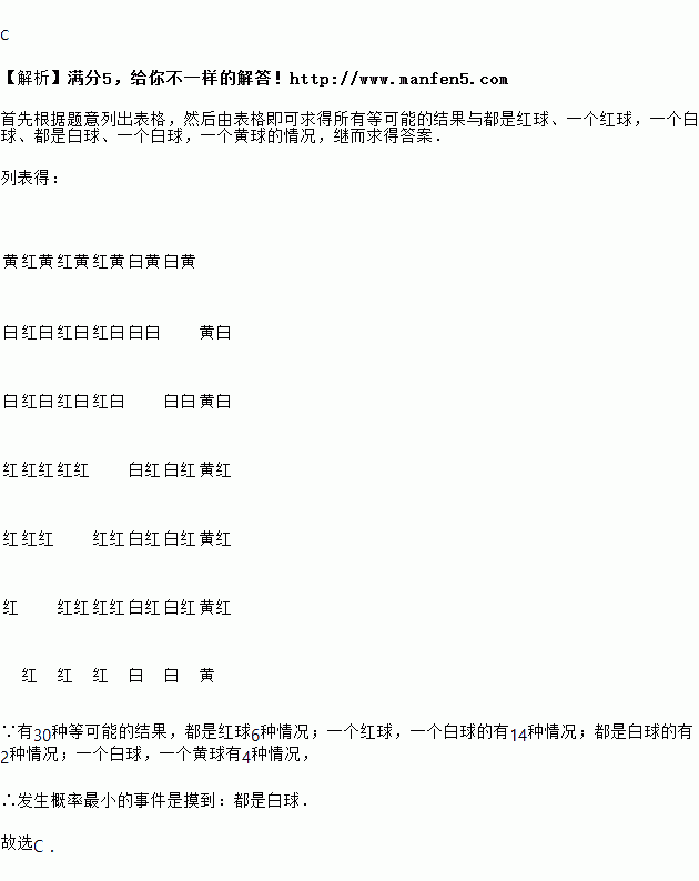 个黄球,每个球除颜色外其他均相同.从这个口袋中同时摸出两个球,发生概率最小的事件是摸到( )![]()