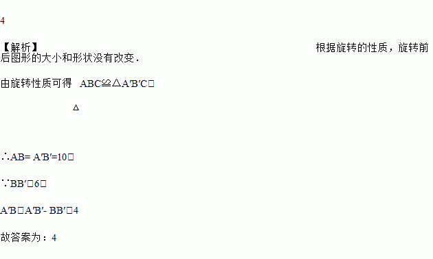 如图所示,将三角形ABC绕点C旋转到三角形A′B′C的位置,使点B恰好落在A′B′上,若AB=10,BB′=6,则A′B=________.