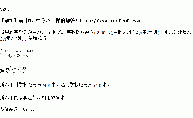 Èçͼ£¬¼×ºÍÒÒͬʱ´ÓѧУ·Åѧ£¬Á½ÈËÒÔ¸÷×ÔËͶÈÔÈËÙ²½Ðлؼң¬¼×µÄ¼ÒÔÚѧУµÄÕýÎ÷·½Ïò£¬ÒҵļÒÔÚѧУµÄÕý¶«·½Ïò£¬ÒÒ¼ÒÀëѧУµÄ¾àÀë±È¼×¼ÒÀëѧУµÄ¾àÀëÔ¶3900Ã×£¬¼××¼±¸Ò»»Ø¼Ò¾Í¿ªÊ¼×öʲҵ£¬´ò¿ªÊé°üʱ·¢ÏÖ´íÄÃÁËÒÒµÄÁ·Ï°²á£®ÓÚÊÇÁ¢¼´²½È¥×·ÒÒ£¬ÖÕÓÚÔÚ;ÖÐ×·ÉÏÁËÒÒ²¢½»»¹ÁËÁ·Ï°²á£¬È»ºóÔÙÒÔÏÈǰµÄËٶȲ½Ðлؼң¬£¨¼×ÔÚ¼ÒÖе¢¸éºÍ½»»¹×÷ÒµµÄʱ¼äºöÂÔ²»¼Æ£©½á¹û¼×±ÈÒÒÍí»Øµ½¼ÒÖУ¬ÈçͼÊÇÁ½ÈËÖ®¼äµÄ¾àÀëyÃ×ÓëËûÃÇ´ÓѧУ³ö·¢µÄʱ¼äx·ÖÖӵĺ¯Êý¹ØÏµÍ¼£¬Ôò¼×µÄ¼ÒºÍÒҵļÒÏà¾à_____Ã×£®