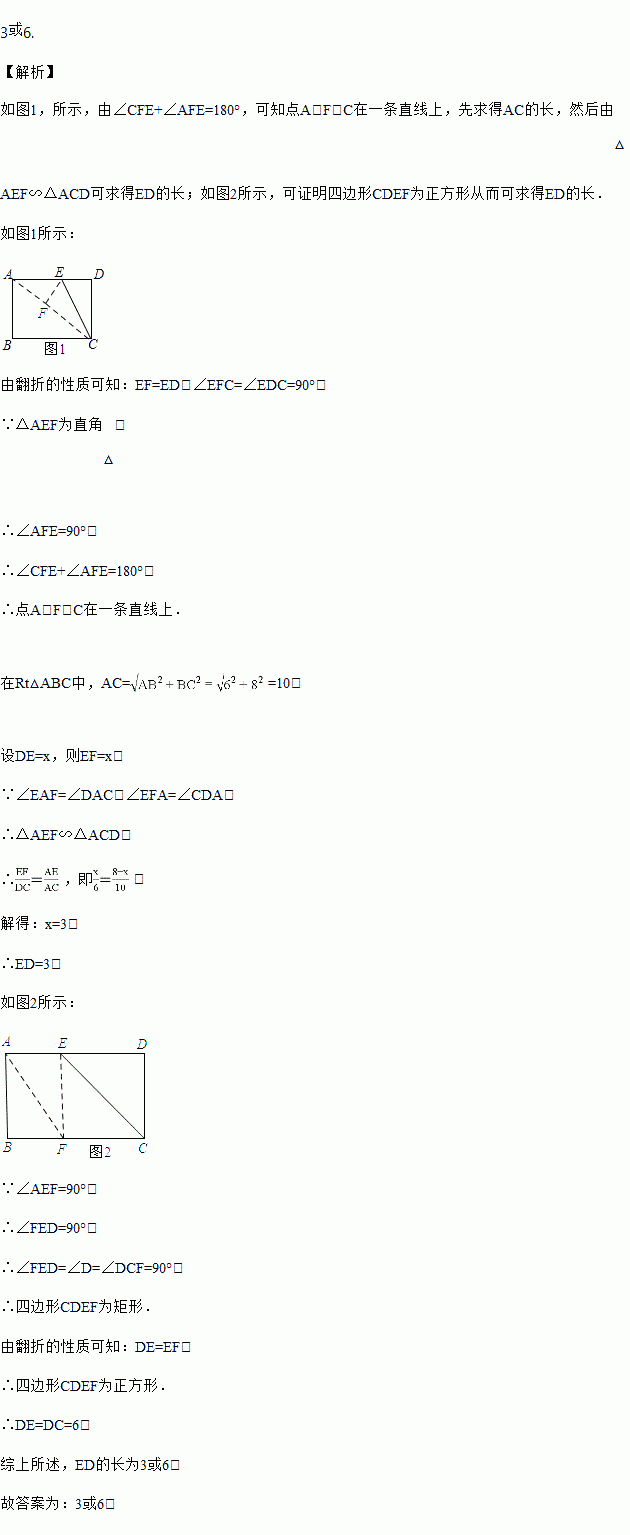 如图,在矩形纸片ABCD中,已知AB=6,BC=8,E是边AD上的点,以CE为折痕折叠纸片,使点D落在点F处,连接FC,当△AEF为直角三角形时,DE的长为_________.
