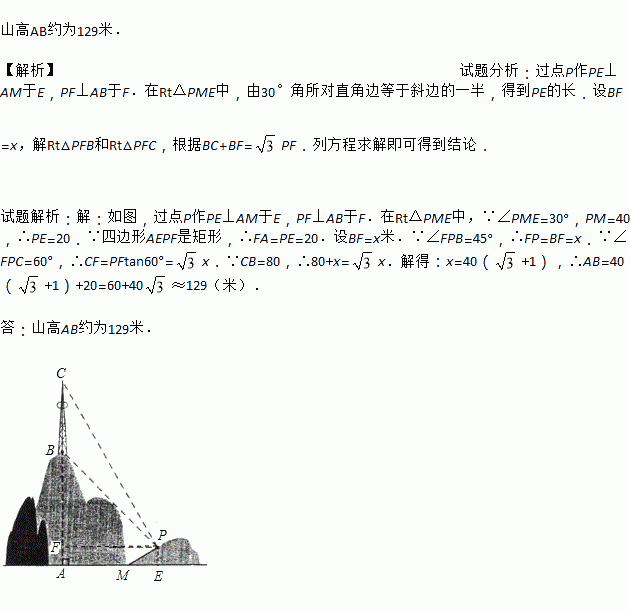 如图,山顶建有一座铁塔,塔高BC=80米,测量人员在一个小山坡的P处测得塔的底部B点的仰角为45°,塔顶C点的仰角为60°.已测得小山坡的坡角为30°,坡长MP=40米.求山的高度AB(精确到1米).(参考数据: