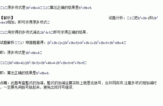 莉莉在计算一个多项式A减去多项式2b2-3b-5的差时,因一时疏忽忘了对两个多项式用括号括起来,因此减式后面两项没有变号,结果得到的差是b2+3b-1.