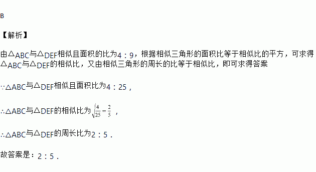 已知△ABC与△DEF相似且面积的比为4:25,则△ABC与△DEF周长的比为( )