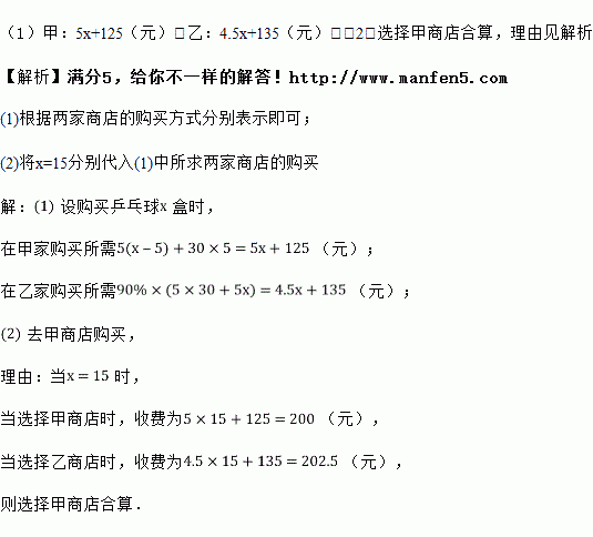 某班将买一些乒乓球和乒乓球拍.了解信息如下:甲、乙两家商店出售两种同样品牌的乒乓球和乒乓球拍.乒乓球拍每副定价30元,乒乓球每盒定价5元;经洽谈:甲店每买一副球拍赠一盒乒乓球;乙店全部按定价的9折优惠.该班需球拍5副,乒乓球若干盒(不小于5盒).问: