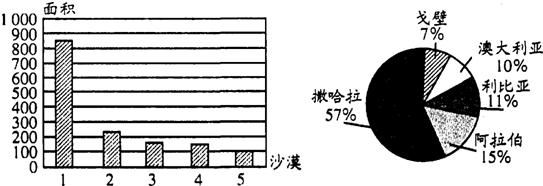 请你根据以上信息,计算出我国内蒙古的戈壁沙漠的面积(精确到个位),并且补全下面的表示五大沙漠面积的条形图和扇形图.