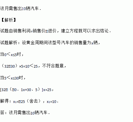 悦达汽车4S店“十一”黄金周销售某种型号汽车,该型号汽车的进价为30万元/辆,若黄金周期间销售量超过5辆时,每多售出1辆,所有售出的汽车进价均降低0.1万元/辆.根据市场调查,黄金周期间销售量不会突破30台.已知该型号汽车的销售价为32万元/辆,悦达汽车4S店计划黄金周期间销售利润25万元,那么需售出多少辆汽车?(注:销售利润=销售价﹣进价)