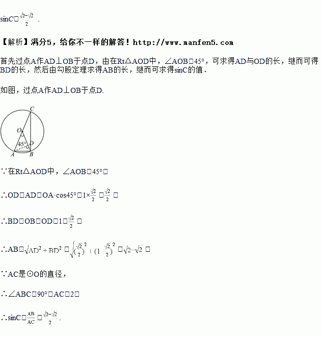 如图,在半径为1的⊙O中,∠AOB=45°,求sinC的值.