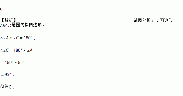 如图,四边形ABCD为圆内接四边形∠A=85°,∠B=105°,则∠C的度数为( )