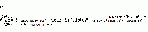 如图,正五边形ABCDE,AF∥CD交BD的延长线于点F,则∠DFA= 度。