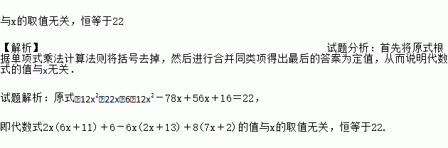 与x的取值无关,恒等于22 【解析】试题分析:首先将原式根据单项式乘法计算法则将括号去掉,然后进行合并同类项得出最后的答案为定值,从而说明代数式的值与x无关. 试题解析:原式=12x2+22x+6-12x2-78x+56x+16=22, 即代数式2x(6x+11)+6-6x(2x+13)+8(7x+2)的值与x的取值无关,恒等于22.