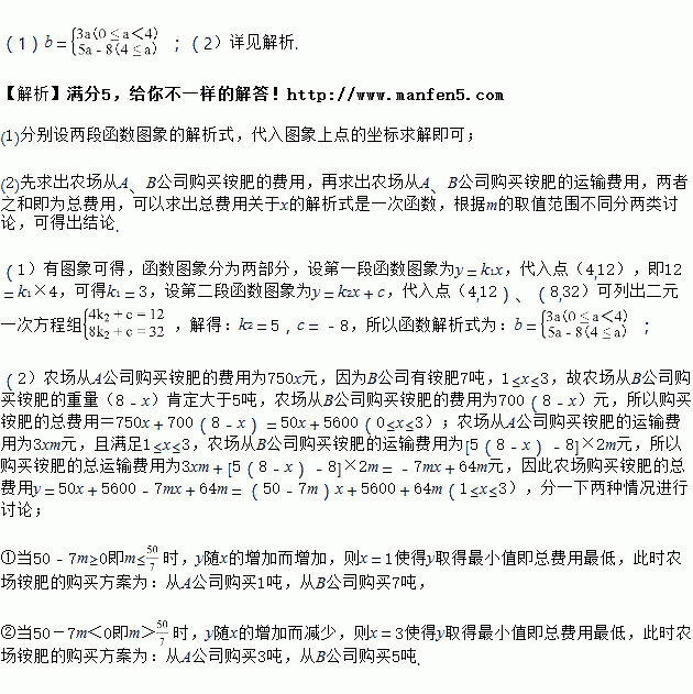 某农场急需铵肥8吨,在该农场南北方向分别有一家化肥公司A、B,A公司有铵肥3吨,每吨售价750元;B公司有铵肥7吨,每吨售价700元,汽车每千米的运输费用b(单位:元/千米)与运输重量a(单位:吨)的关系如图所示.