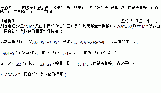 已知AD⊥BC,FG⊥BC,垂足分别为D、G,且∠1=∠2,求证∠BDE=∠C.