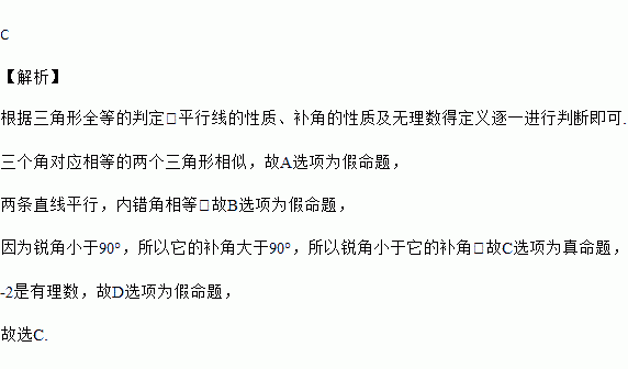 A. 三个角对应相等的两个三角形全等 B. 内错角相等