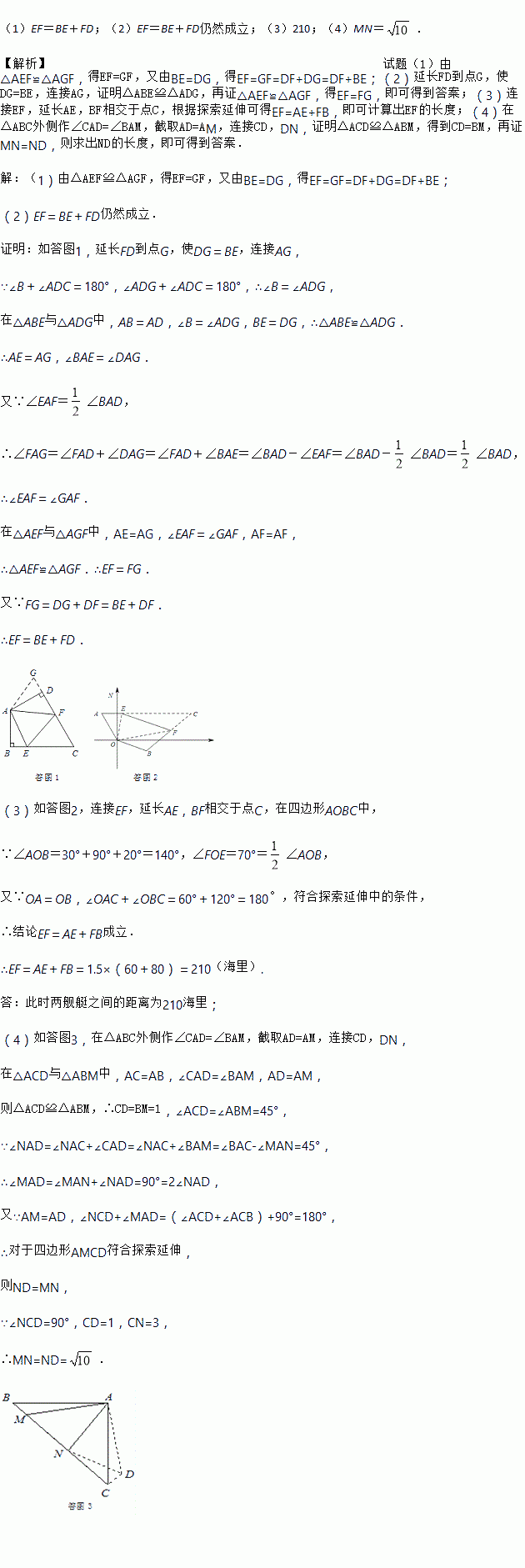 如图1,在四边形ABCD中,AB=AD,∠BAD=120°,∠B=∠ADC=90°,E、F分别是BC,CD上的点,且∠EAF=60°,探究图中线段BE,EF,FD之间的数量关系.