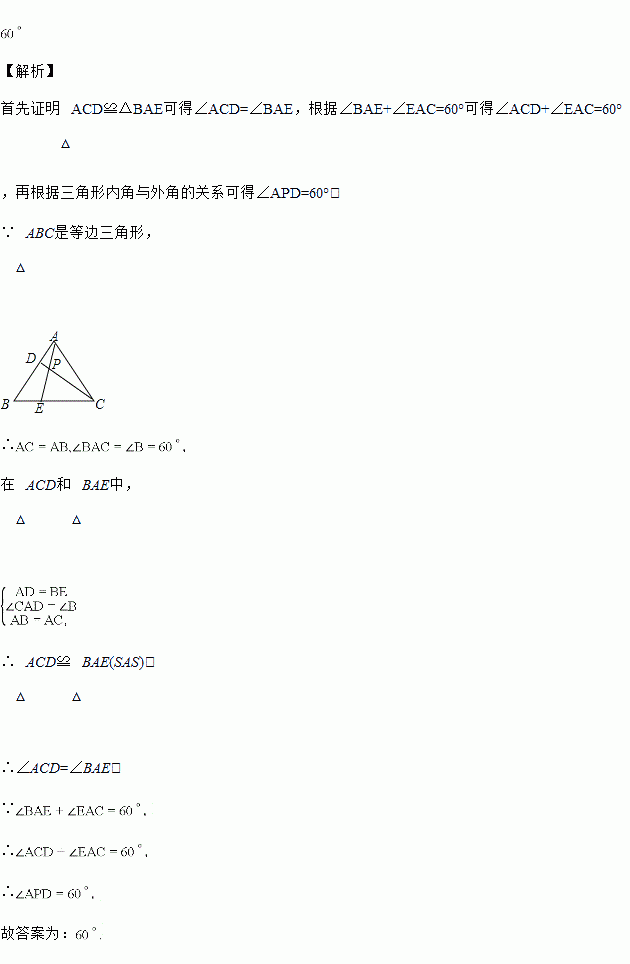 在等边三角形ABC中,点D在AB边上,点E在BC边上,且连接AE、CD交于点P,则______.