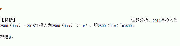 B 【解析】试题分析:2014年投入为2500(1+x),2015年投入为2500(1+x)(1+x),即2500(1+x)2=3600; 故选B.