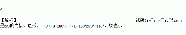 A 【解析】试题分析:∵四边形ABCD是⊙O的内接四边形,∴∠D+∠B=180°,∴∠D=180°﹣70°=110°,故选A.