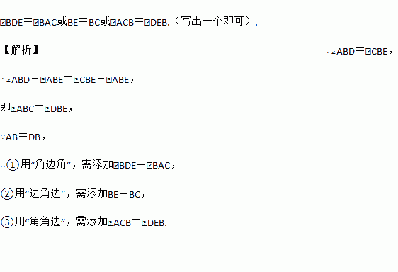 如图所示,AB=DB,∠ABD=∠CBE,请你添加一个适当的条件_____,使△ABC≌△DBE(只需添加一个即可,不添加辅助线).