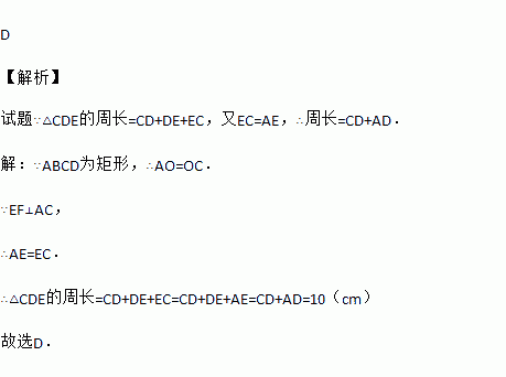 如图,矩形ABCD的周长为20cm,两条对角线相交于O点,过点O作AC的垂线EF,分别交AD,BC于E,F点,连接CE,则△CDE的周长为( )