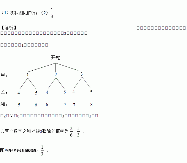 (1)树状图见解析;(2). 【解析】试题分析:先根据题意画树状图,再根据所得结果计算两个数字之和能被3整除的概率. 试题解析:(1)树状图如下: (2)∵共6种情况,两个数字之和能被3整除的情况数有2种, ∴两个数字之和能被3整除的概率为, 即P(两个数字之和能被3整除)=.