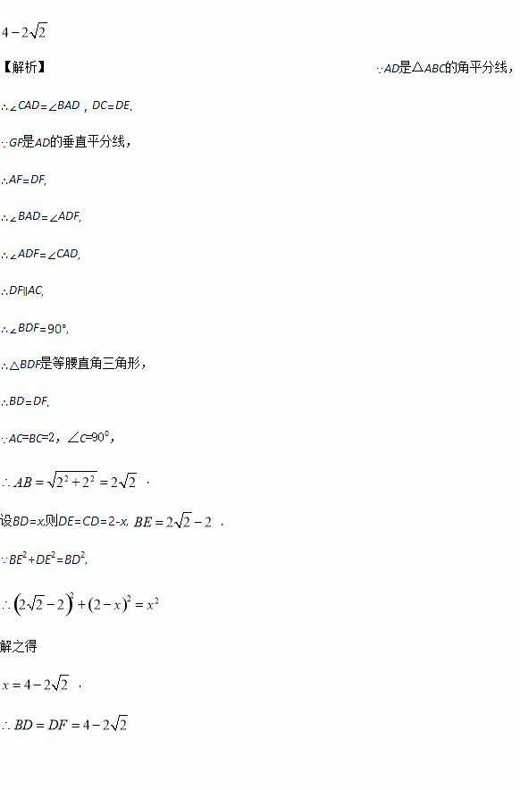 如图,在△ABC中,AC=BC=2,∠C=900,AD是△ABC的角平分线,DE⊥AB,垂足为E,AD的垂直平分线交AB于点F,则DF的长为 __________________
