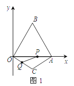 已知:如图1,△OAB是边长为2的等边三角形,OA在x轴上,点B在第一象限内;△OCA是一个等腰三角形,OC=AC,顶点C在第四象限,∠C=120°.现有两动点P、Q分别从A、O两点同时出发,点Q以每秒1个单位的速度沿OC向点C运动,点P以每秒3个单位的速度沿A→O→B运动,当其中一个点到达终点时,另一个点也随即停止.