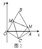 (3)如图2,现有∠MCN=60°,其两边分别与OB、AB交于点M、N,连接MN.将∠MCN绕着C点旋转(0°<旋转角<60°),使得M、N始终在边OB和边AB上.试判断在这一过程中,△BMN的周长是否发生变化?若没有变化,请求出其周长;若发生变化,请说明理由.