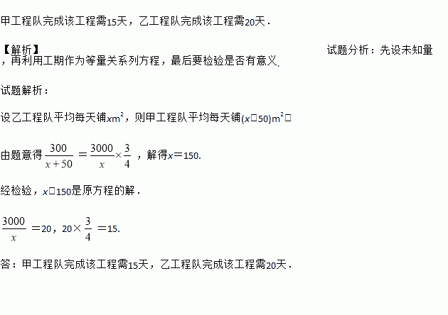 某新建的商场有3000m2的地面花岗岩需要铺设,现有甲、乙两个工程队希望承包铺设地面的工程.甲工程队平均每天比乙工程队多铺50m2,甲工程队单独完成该工程的工期是乙工程队单独完成该工程所需工期的