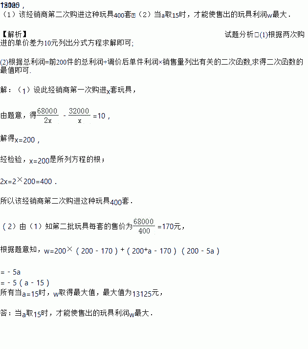 (2)由于第二批玩具进价上涨,经销商按第一批玩具售价销售200套后,准备调整售价,发现若每套涨价1元,则会少卖5套,已知第一批玩具售价为200元.设第二批玩具销售200套后每套涨价a元,第二批卖出的玩具总利润w元,问当a取多少时,才能使售出的玩具利润w最大?