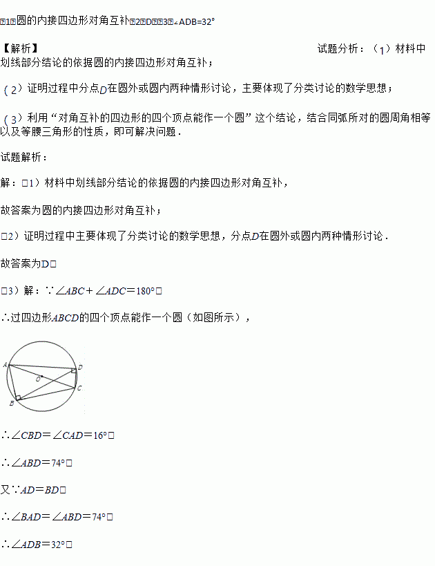 (3)如图(3),在四边形ABCD中,∠ABC=∠ADC=90°,∠CAD=16°.AD=BD,则求∠ADB的大小.