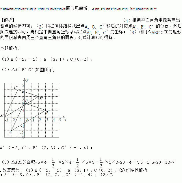(2)若把△ABC向上平移2个单位,再向左平移1个单位得到△A′B′C′,写出 A′、B′、C′的坐标,并在图中画出平移后图形.