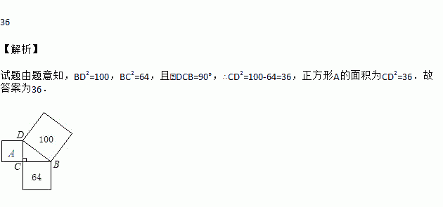 如图,以直角三角形一边向外作正方形,其中两个正方形的面积为100和64,则正方形A的面积为 .