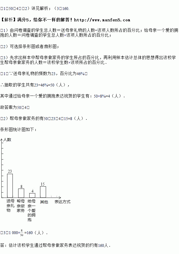 (1)本次问卷调查抽取的学生共有 人,其中通过给母亲一个爱的拥抱表达祝贺的学生有 人.