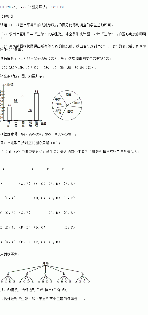 个主题中任选两个进行调查,根据(2)中调查结果,用树状图或列表法,求恰好选到学生关注最多的两个主题的概率(将互助、平等、感恩、和谐、进取依次记为A、B、C、D、E).