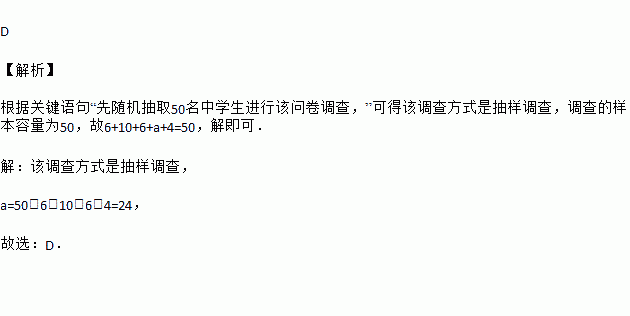 D 【解析】 根据关键语句“先随机抽取50名中学生进行该问卷调查,”可得该调查方式是抽样调查,调查的样本容量为50,故6+10+6+a+4=50,解即可. 【解析】 该调查方式是抽样调查, a=50﹣6﹣10﹣6﹣4=24, 故选:D.