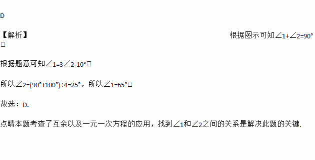 D 【解析】根据图示可知∠1+∠2=90°, 根据题意可知∠1=3∠2-10°, 所以∠2=(90°+100°)÷4=25°,所以∠1=65°, 故选:D. 点睛本题考查了互余以及一元一次方程的应用,找到∠1和∠2之间的关系是解决此题的关键.