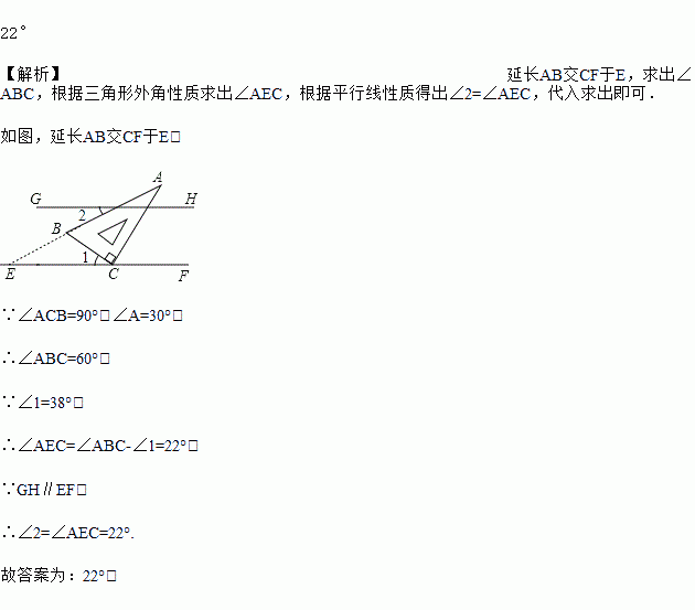 如图,把一块含有30°角的直角三角板的直角顶点放在相互平行的两条直线的其中一条上,如果∠1=38°,那么∠2的度数是______________.