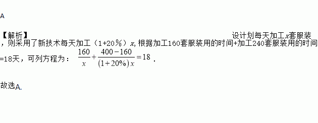 某服装厂准备加工400套运动装,在加工完160套后,采用了新技术,使得工作效率比原计划提高了20%,结果共用了18天完成任务,问计划每天加工服装多少套?在这个问题中,设计划每天加工x套服装,则根据题意可得方程为( )