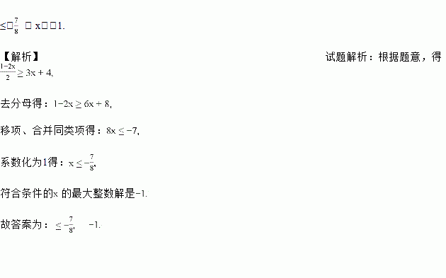 当x_________时,代数式的值不小于3x+4的值,符合条件的x的最大整数解是_________;