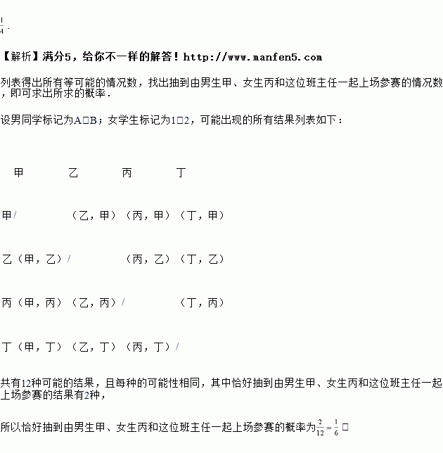 某校组织一项公益知识竞赛,比赛规定:每个班级由2名男生、2名女生及1名班主任老师组成代表队.但参赛时,每班只能有3名队员上场参赛,班主任老师必须参加,另外2名队员分别在2名男生和2名女生中各随机抽出1名.初三(1)班由甲、乙2名男生和丙、丁2名女生及1名班主任组成了代表队,求恰好抽到由男生甲、女生丙和这位班主任一起上场参赛的概率.(请用“画树状图”或“列表”或“列举”等方法给出分析过程)