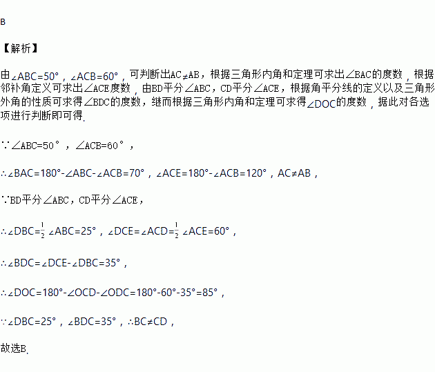 如图,在中,,,点E在BC的延长线上,的平分线BD与的平分线CD相交于点D,连接AD,则下列结论中,正确的是