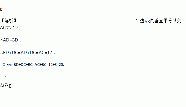 B 【解析】∵边AB的垂直平分线交AC于点D, ∴AD=BD, ∴BD+DC=AD+DC=AC=12, ∴C△BDC=BD+DC+BC=AC+BC=12+8=20. 故选B.