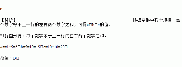 1261年,我国南宋数学家杨辉用图中的三角形解释二项和的乘方规律,比欧洲的相同发现要早三百多年,我们把这个三角形称为“杨辉三角”,请观察图中的数字排列规律,则a,b,c的值分别为( )