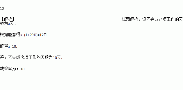 甲独做12天完成工作,乙工作效率比甲高20℅,则乙完成这项工作的天数为_______.
