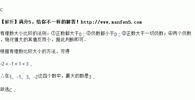 在1、﹣1、3、﹣2这四个数中,最大的数是( )
